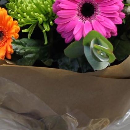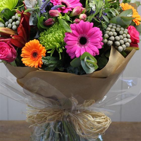 Hot pink, lime green and orange blooms expertly combined to create a show stopping vibrant hand tied bouquet. Perfect for an celebration or just because.