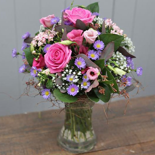 A dainty lilac and pink hand tied posy including roses, lisanthus and september flower presented in a glass vase.
