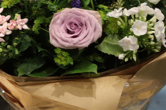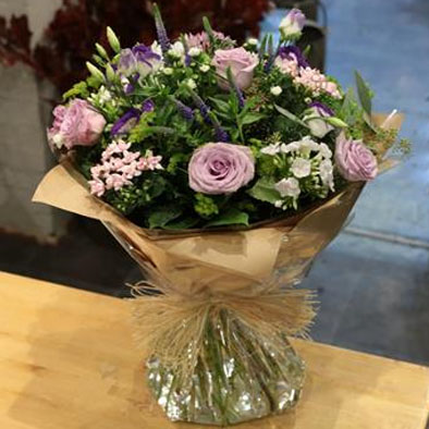 A vintage look hand tied bouquet in lilacs and purples including roses, phlox, bouvardia, veronica and lisianthus.