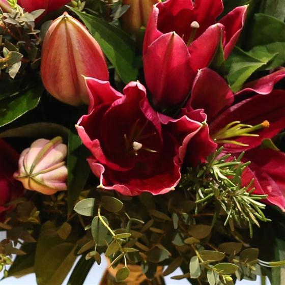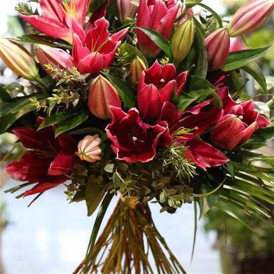 A large hand tied bouquet of highly scented pink lilies presented in water. Please note lilies will be delivered in bud to ensure maximum vase life.