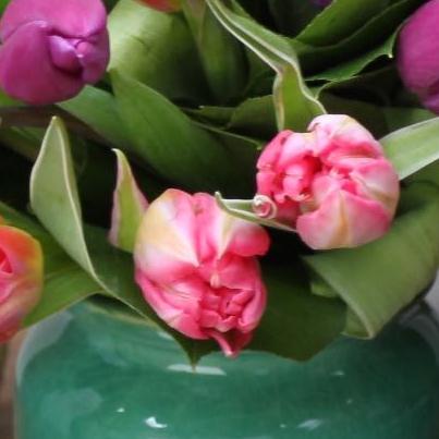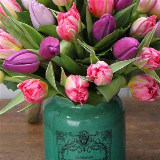 A vintage ceramic vase filled with seasonal tulips in shades of pinks and purples.