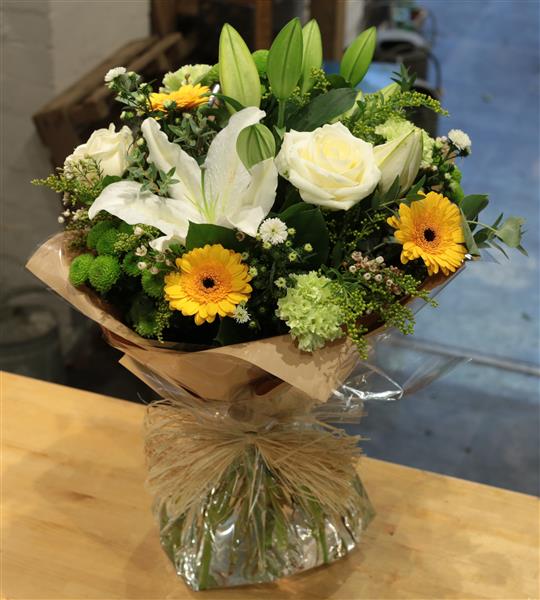 A crisp white and lime hand tied bouquet including roses, lilies and chrysanthemums highlighted with sunshine yellow mini gerberas.