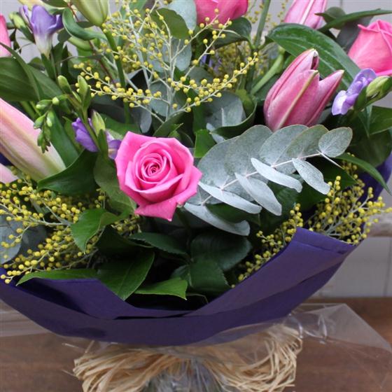 Large headed long stemmed pink roses, beautifully scented freesias and lilies mixed with spring foliage to make up this feminine hand tied bouquet.