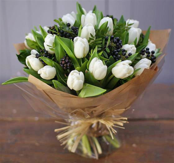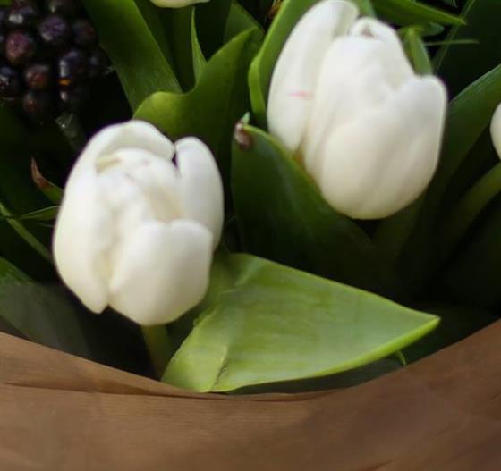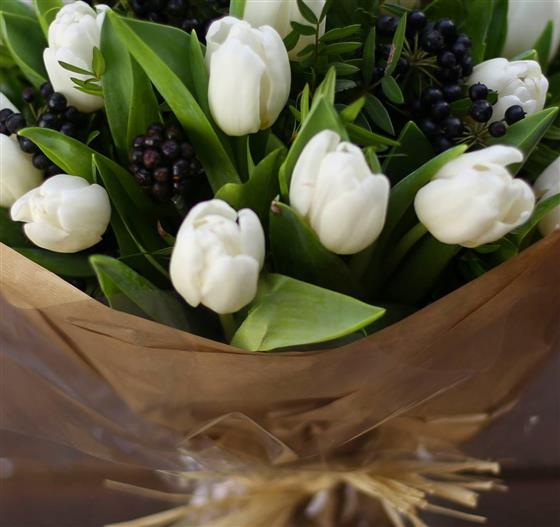 A chunky hand tied posy of white Dutch tulips and seasonal foliage. Simple and stylish.